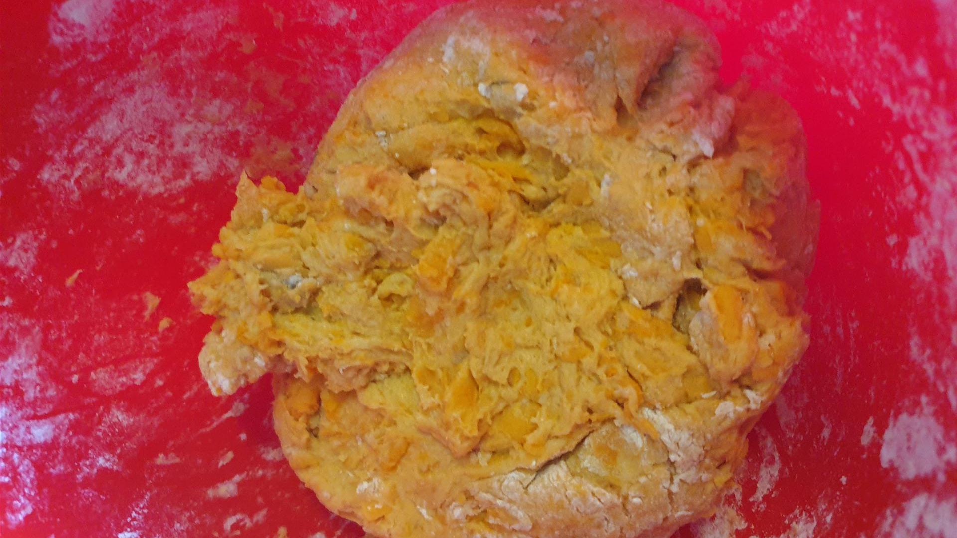 Süßkartoffel Abgießen. Zu dem Mehl Salz und Öl geben. Ich habe alles mit den Händen zu einem Teig geknetet, habe mich allerdings ein paar Mal verbrannt. Wenn ihr schlauer seid als ich, wartet ihr bis ihr die Süßkartoffel anfassen könnt oder jagt sie vorher durch einen Kartoffelstampfer. Den noch etwas klebrigen Teig auf einem Backpapier zu einem recht dünnen teig ziehen (ich würde es nicht mit einem Nudelholz ausrollen, der Teig würde festkleben, die Hände tun es auch). Für 20-25 Minuten (je nach Bräune) bei 180°/Umluft backen
